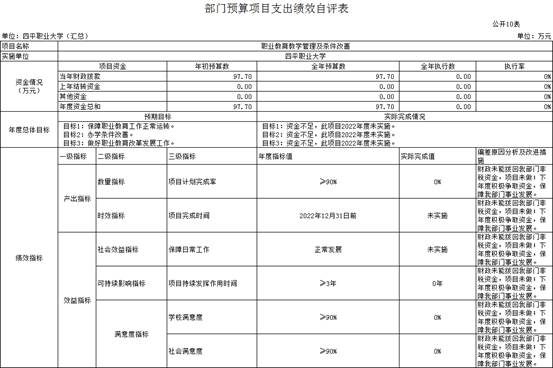 1、組織對2022年度部門預算“職業教育教學管理及條件改善”項目、“學生管理及資助”項目、“教育行政管理及改革”項目、“教育設施建設與發展”項目等4個一級項目進行了績效自評,共涉及資金97.7萬元,績效自評率為100%;組織對2022年度部門預算“校園零修及鍋爐維修維護項目”項目、“四平職業大學考試考務費項目”項目、“電費”項目等3個二級項目進行了績效自評,共涉及資金97.7萬元,績效自評率為100%。