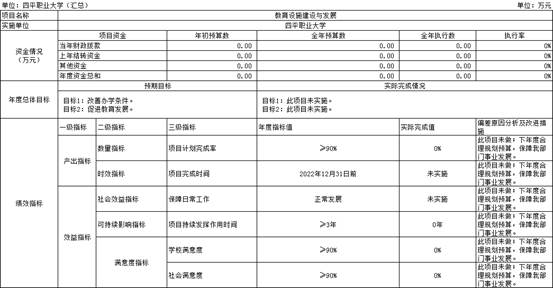 (2)根據年初績效目標,我部門一級項目“學生管理及資助”年初預算數0萬元,全年執行數0萬元,執行率0%。績效目標完成情況:此項目未實施。偏差原因分析及改進措施:此項目未做;下年度合理規劃預算,保障我部門事業發展。此項目自評得分0分。