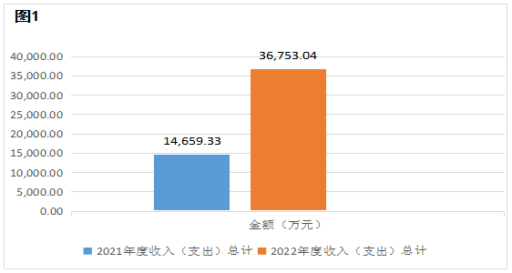 2022年度收、支總計各36753.04萬元。與2021年相比,收、支總計各增加22093.71萬元,增長150.7%。主要原因:2022年度增加專項撥款。圖1所示: