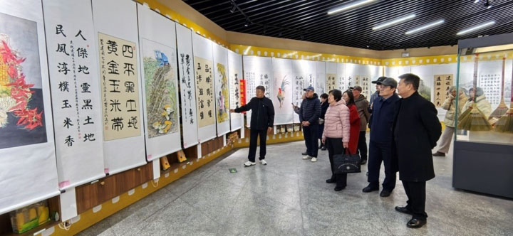 步入“黑土玉米”“鄉(xiāng)土風(fēng)情”“家鄉(xiāng)禮贊”展區(qū),《家鄉(xiāng)禮贊》長卷以工筆重彩呈現(xiàn)玉米黃金帶、現(xiàn)代農(nóng)業(yè)園等新時(shí)代畫卷,生動(dòng)展現(xiàn)四平從“英雄城”到“現(xiàn)代糧都”的蛻變。退休黨員們欣喜地發(fā)現(xiàn),作品中既有七星山、葉赫古城等文化地標(biāo),也有無人機(jī)播種、智慧農(nóng)業(yè)等科技元素。“看著畫里飽滿的玉米穗和現(xiàn)代化的農(nóng)機(jī),就像看到了四平幾十年發(fā)展的縮影!”曾在教育戰(zhàn)線工作多年的老黨員們激動(dòng)地說道。