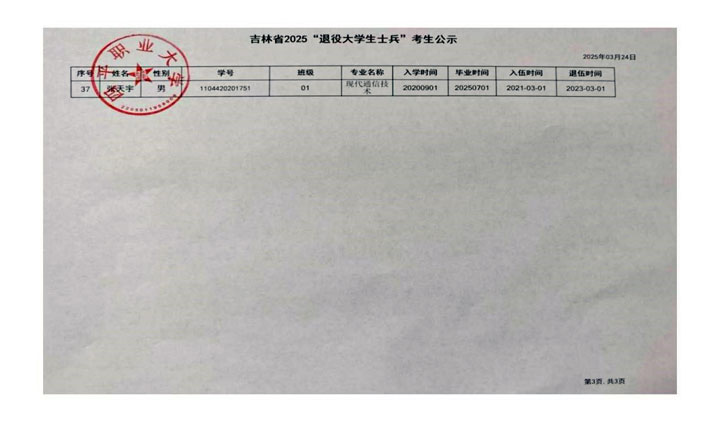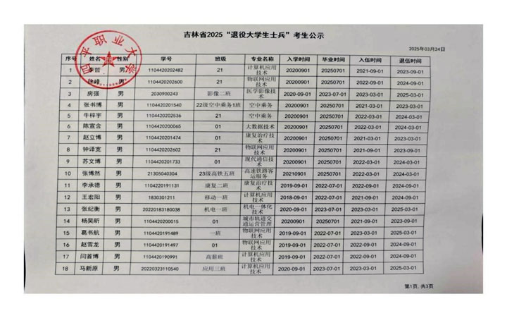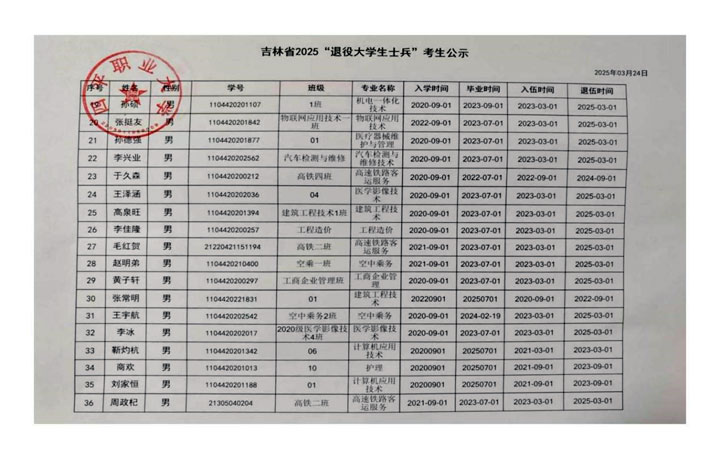 根據(jù)吉林省考試院2025專升本考試報名要求,我校現(xiàn)將2025年專升本考試報名中的退役大學(xué)生士兵考生公示如下: