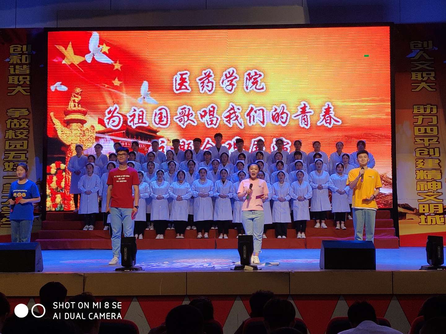 (通訊員盧晶)2019年5月17日在學校多功能報告廳醫藥學院千余名同學,激情演繹大合唱《我和我的祖國》,本次活動從策劃到籌備歷時兩個月,“班級有歌聲,人人都參與”。 演繹現場氣氛熱烈、和諧,各班輔導員和學生全身心投入其中,發揮了最高的水平,真是各盡其能,各展其才!段液臀业淖鎳贰睹魈鞎谩贰蹲屛覀兪幤痣p槳》《革命人永遠最年輕》《歌唱祖國》《國家》《隱形的翅膀》《保衛黃河》等一首首精心選取的歌曲在展演中響起,觀眾席上不時響起熱烈的掌聲,校園陽光明媚,展演青春唱響,所有的人都沉浸在這美妙的氛圍中。
