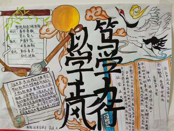 學風建設是高校教育的重要組成部分,良好的學風對于塑造積極向上的校園文化、提升學生的學習效果和培養優秀的人才具有至關重要的作用。 為推動學風建設,提高同學們的學習熱情和綜合素質,進一步落實立德樹人根本任務,營造良好的育人氛圍,引導學生明確學習目標,提高學生參與度,智能制造工程學院于學風建設活動月期間,組織開展了以“工匠精神正學風”為主題的手抄報制作活動。 |